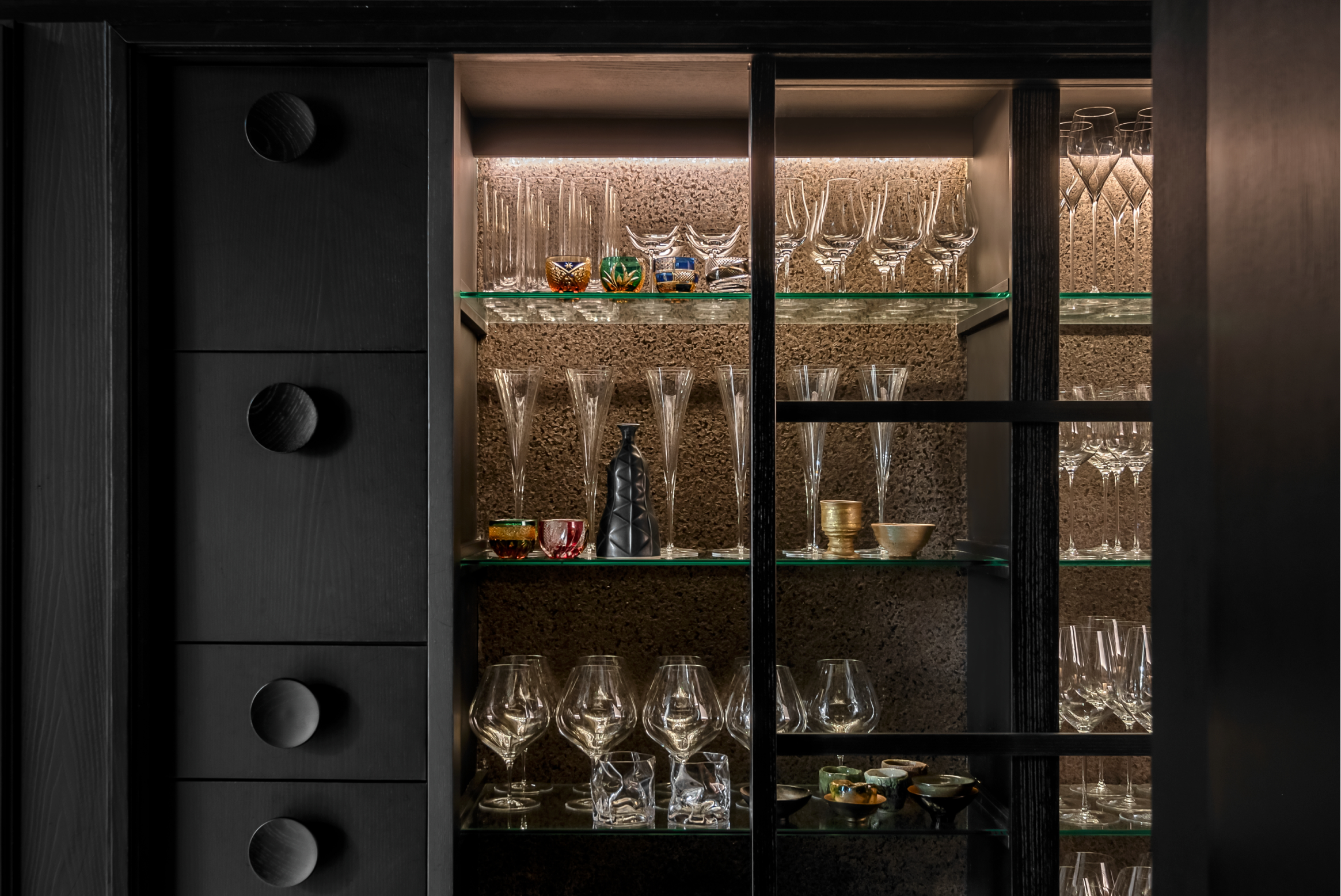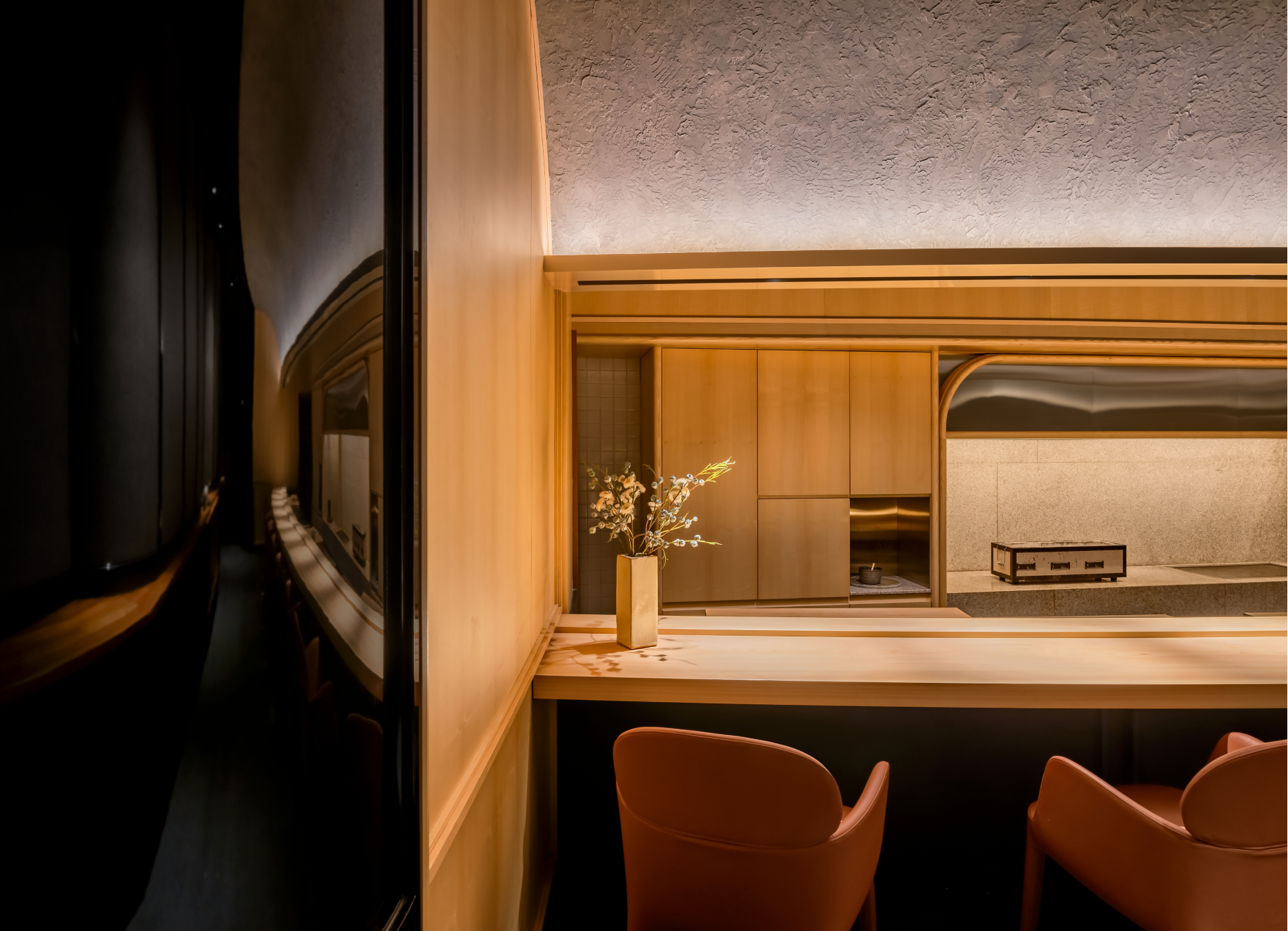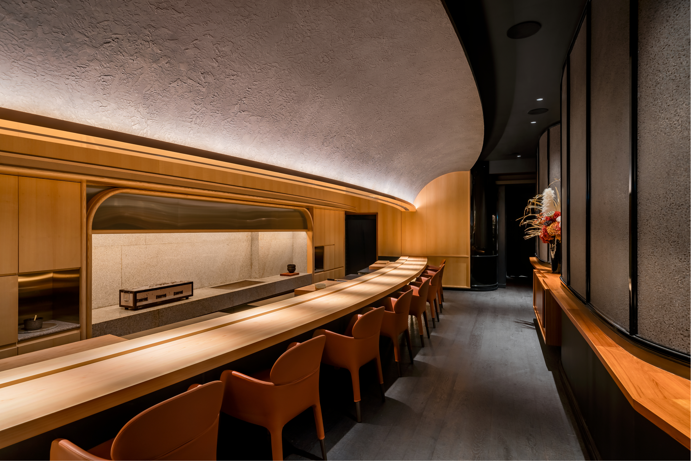 Chef Kazuhiro's cuisine is honoured by a seemingly simple interior design scheme. Guests dine at the 12-seat brushed Hinoki timber counter which is in a curved shape to encourage interaction amongst guests. Dark-stained solid Oak timber is on the floor which contrasts against the solid White Ash timber used throughout wall panelling and cabinetry. The elegant leather bar chairs are from Pedrali.
