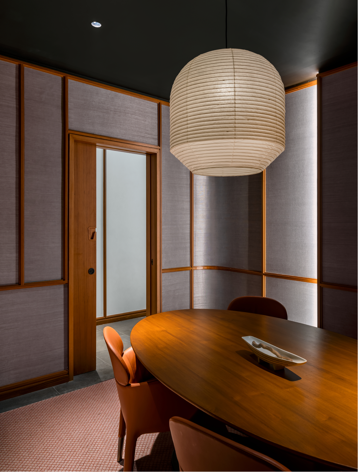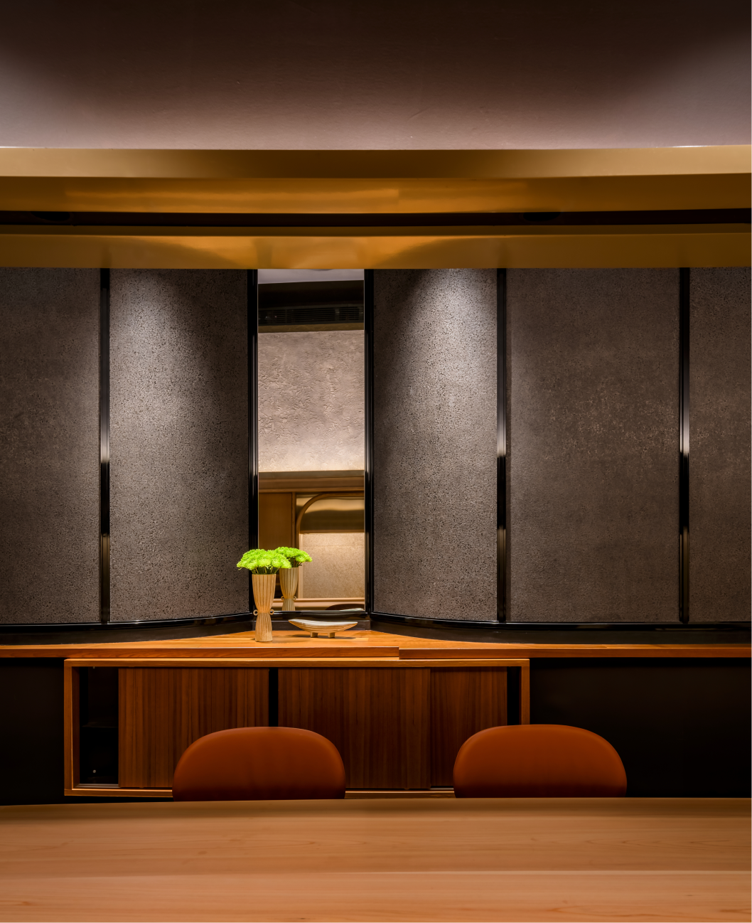Arrival is a discrete journey through the S-shaped corridor past the small private dining room, and then the theatre of the space is revealed. Hamamoto restaurant is a modern interpretation of Japanese design form and materiality. The owner wanted to make the space as a stage for the chef to create in front of his guests, so a proscenium arch frames this intimate moment.