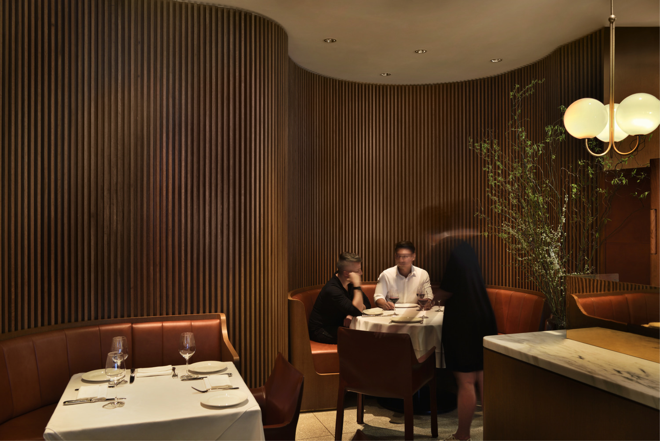 A beautifully curved slatted timber banquette wall was ingeniously created out of a technical challenge, which is keeping the space needed back of house for the grease trap. Deliberate level changes throughout the dining area create distinct seating zones, while careful attention to circulation and service areas led to the inclusion of popular two-seater corner seats.