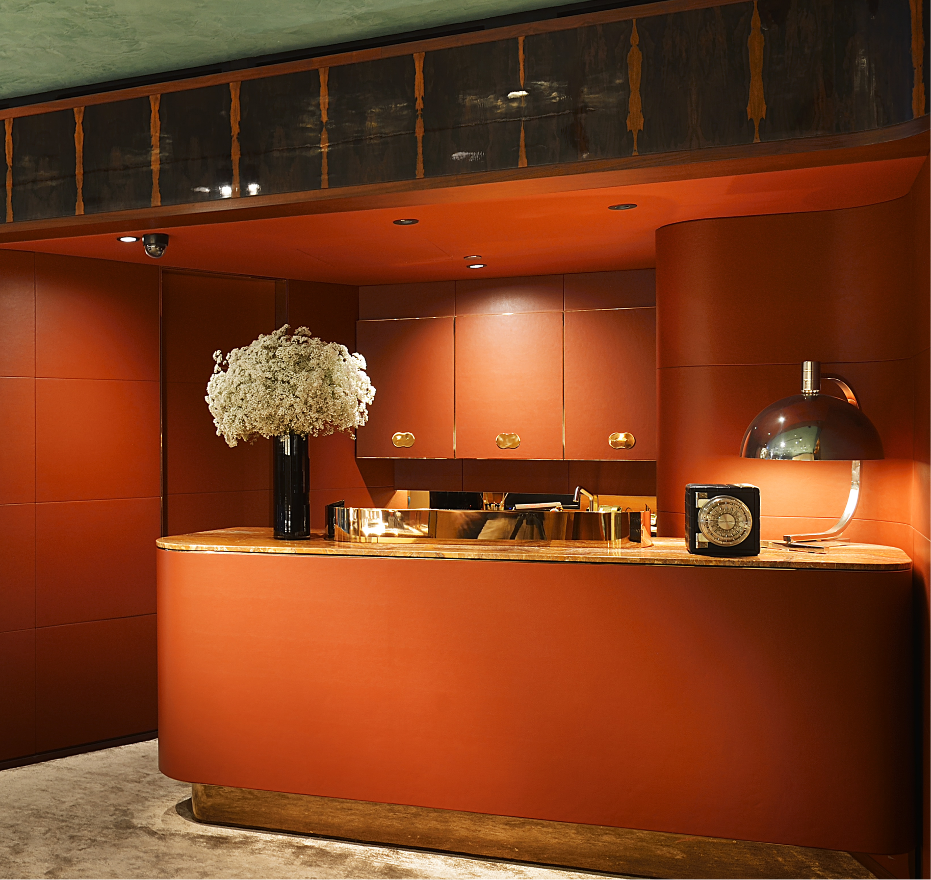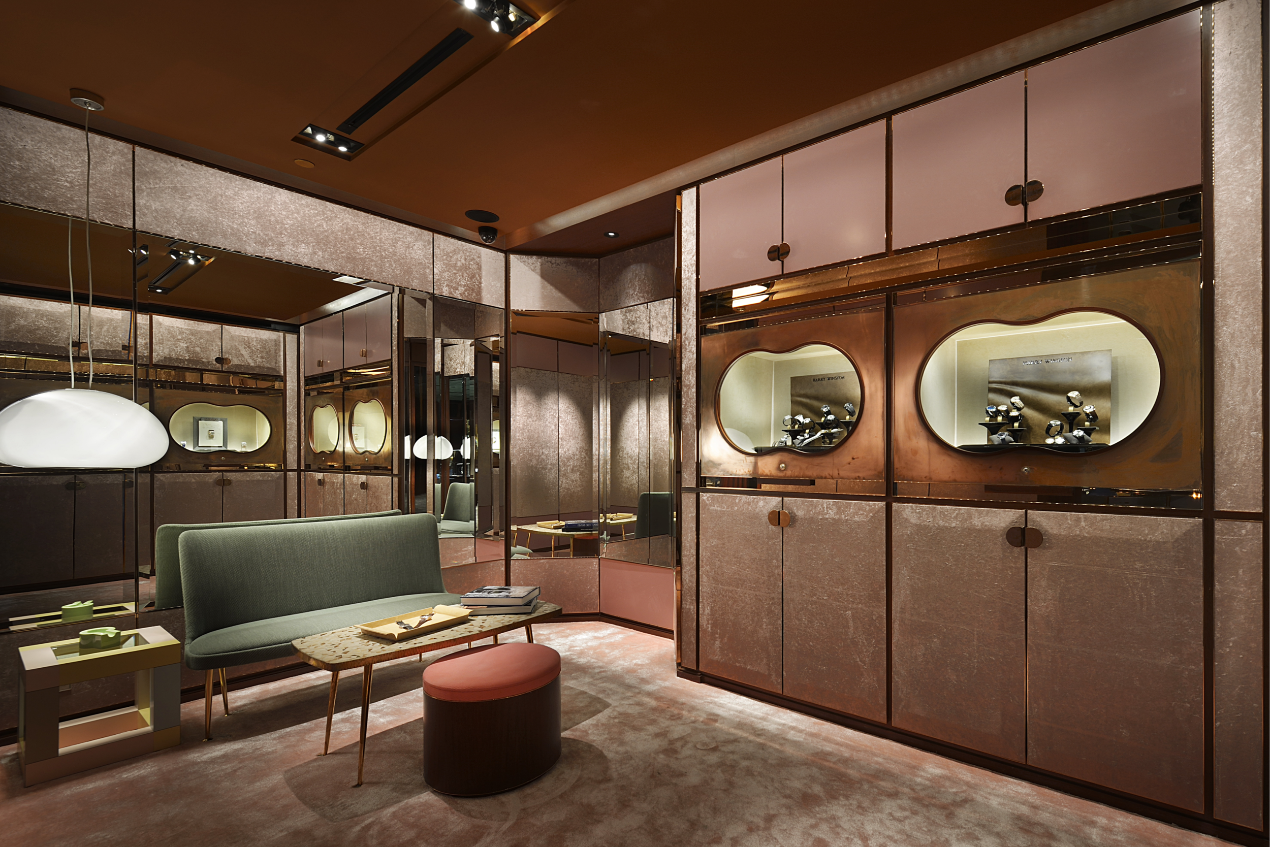 Two private salons which lead from the main retail space provide a lush contrast with velvet wall panels enveloping each room. One room in pink and the other with blue velvet wall panels, both with timber trims, mirror and polished brass accents. Italian mid-century furniture in these rooms rounds out the scheme.