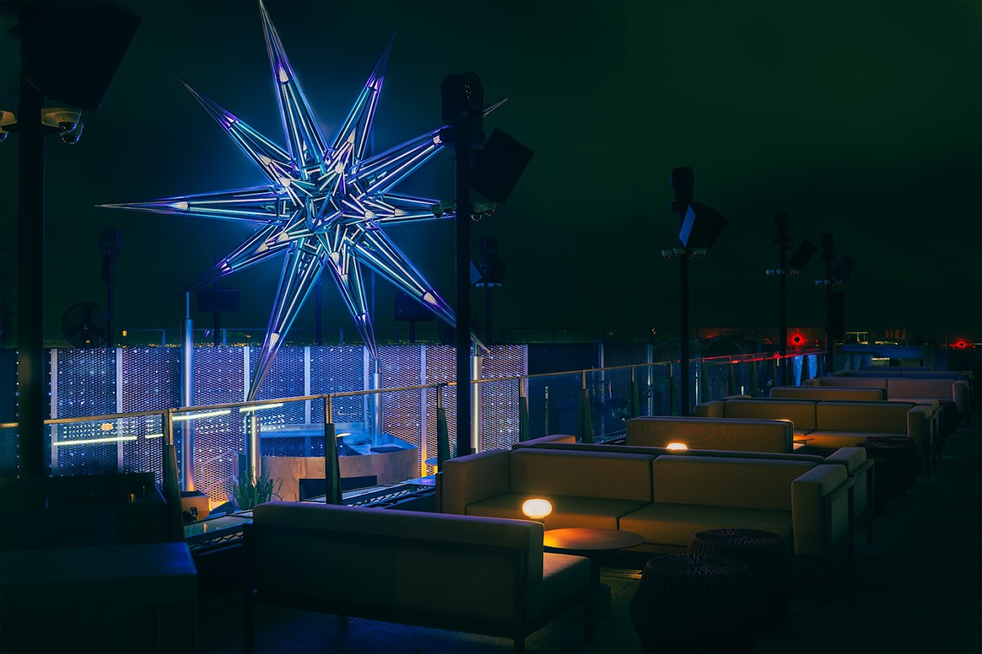 Walls adorned with sleek steel and aluminium panels frame the space, while the central DJ booth, constructed from similar materials, serves as a focal point, enhancing the modern aesthetic. Balancing this contemporary design, natural wooden flooring and lush decorative plants introduce warmth and a touch of nature, ensuring the ambiance remains fresh and welcoming. Dominating the venue is ASTRA, a colossal, star-shaped installation by light artist Jun Ong. This dynamic sculpture not only captures the urban energy of Singapore but also serves as a visual centre-piece, its reflective surfaces and illumination symbolizing the fusion of celestial and urban elements. Overall, NOVA's design offers a harmonious blend of modernity and nature, providing a unique and elevated nightlife experience.