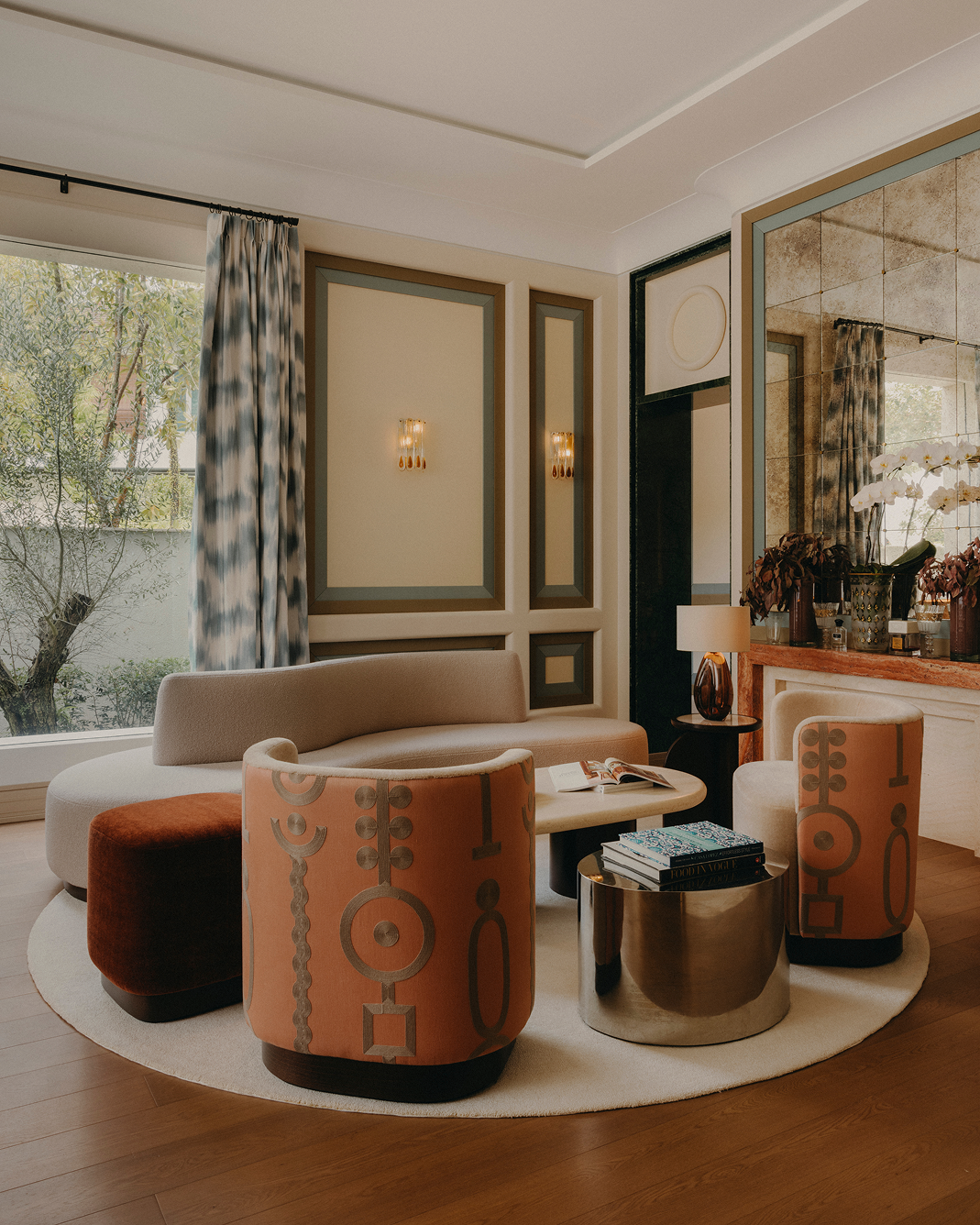 The attic houses a private suite with a walnut timber bar and green stucco walls. Han's personal touch is evident in vintage Murano glass wall sconces and a custom cream sofa with elegant curves, reflecting her penchant for timeless decor. The kitchen, a central hub for family gatherings, features stained oak cabinetry, a butler's sink, and a red La Cornue stove, seamlessly connecting to an outdoor pool area framed by olive and lemon trees, evoking the charm of Mediterranean living.