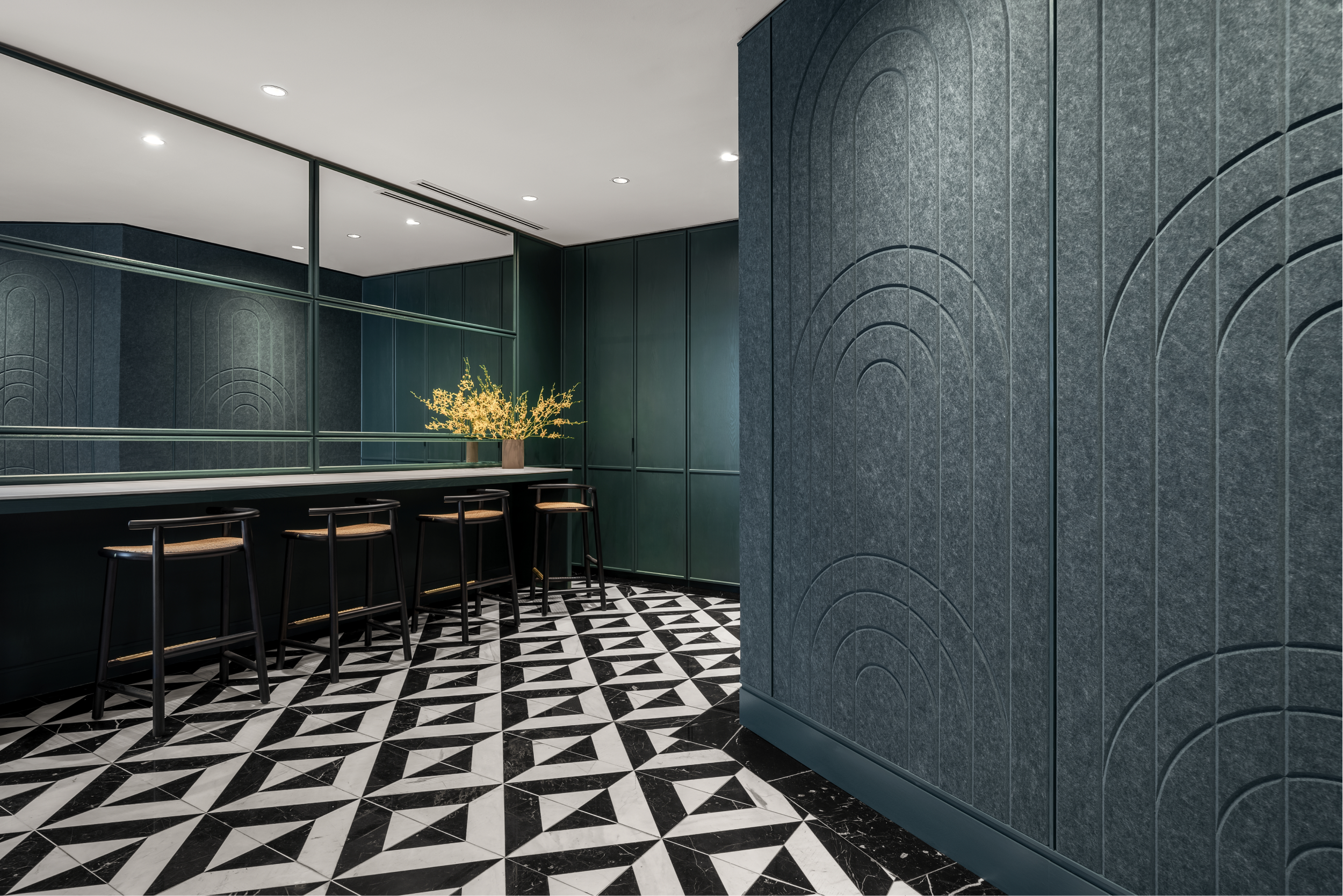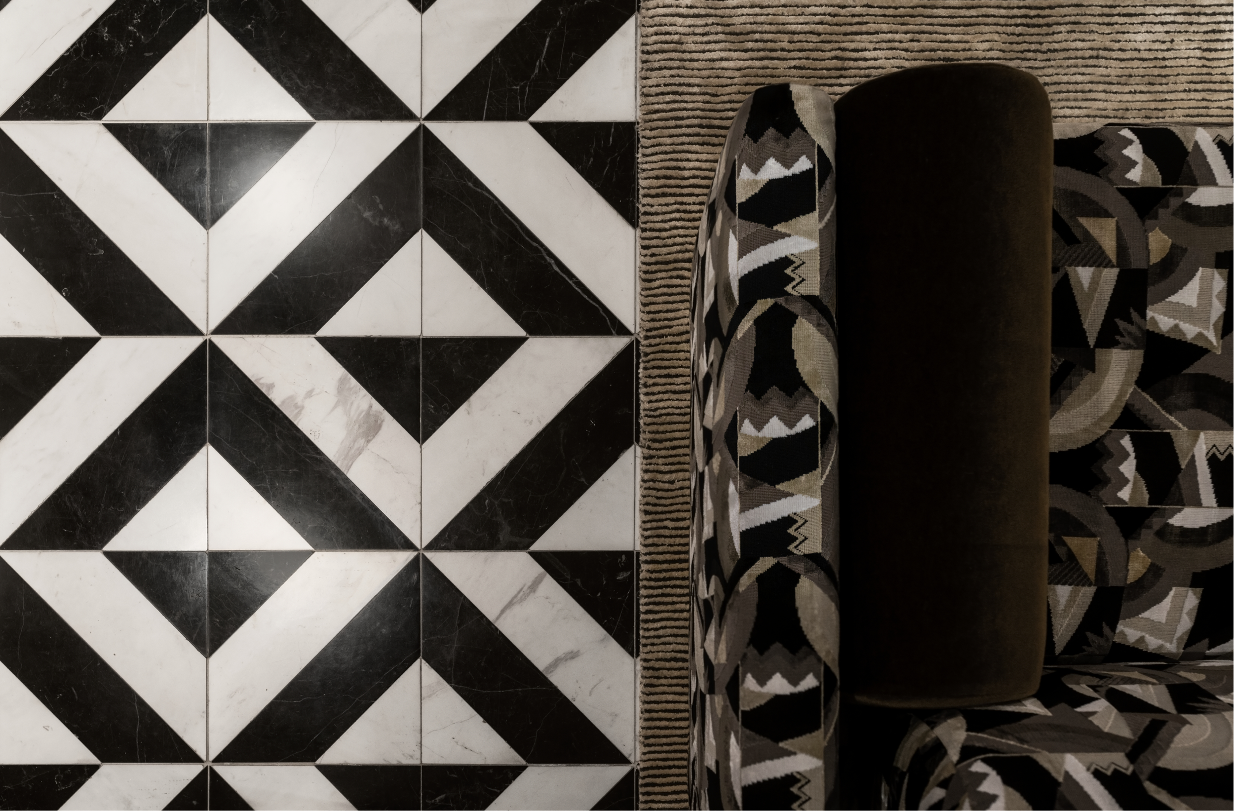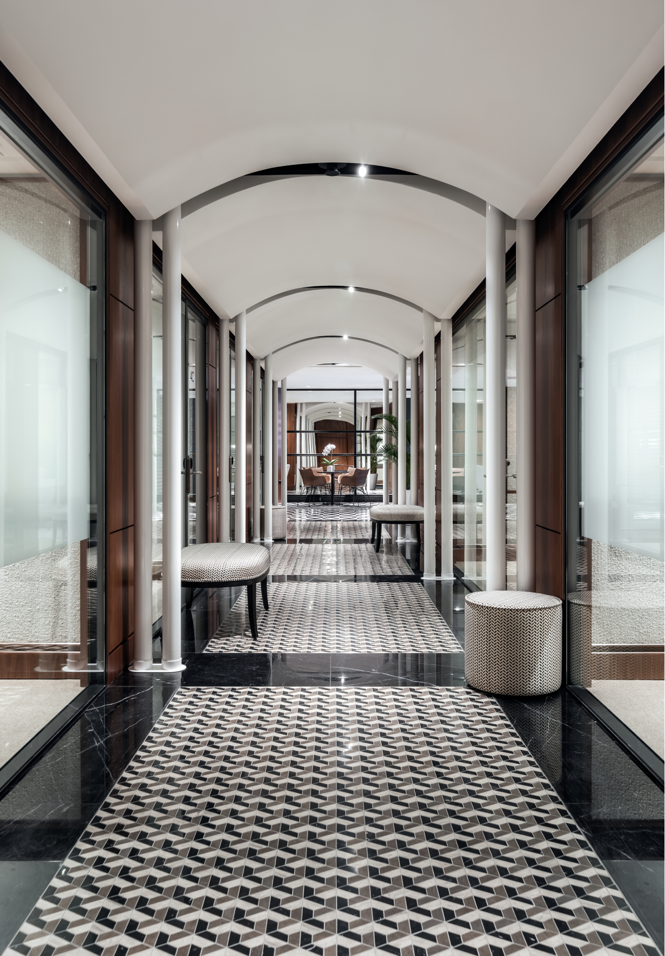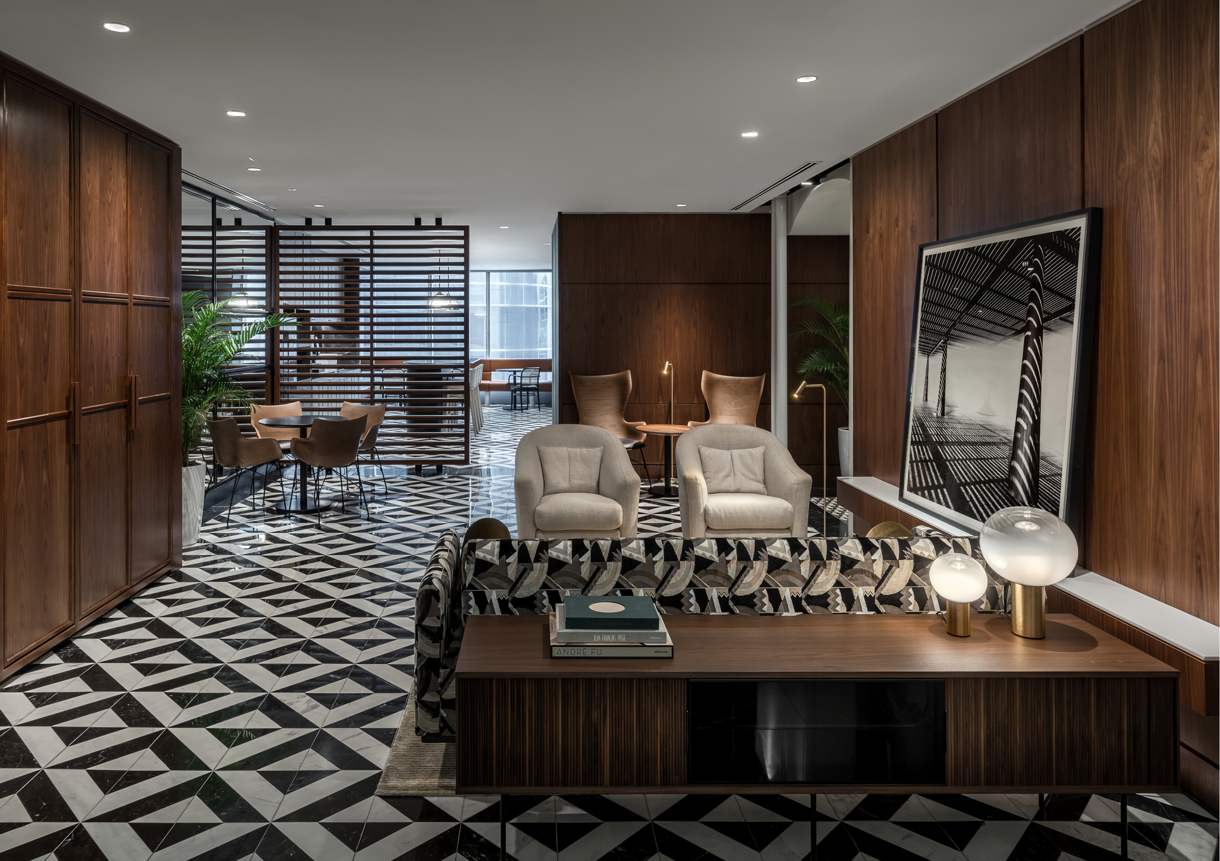 Inspiration for this project comes from the classic corporate interiors by Florence Knoll for the likes of CBS, Chase Manhattan Bank or the Rockefeller family. This interior features a sophisticated and contemporary art deco scheme with strong black and white colours, and walnut timber panelling.