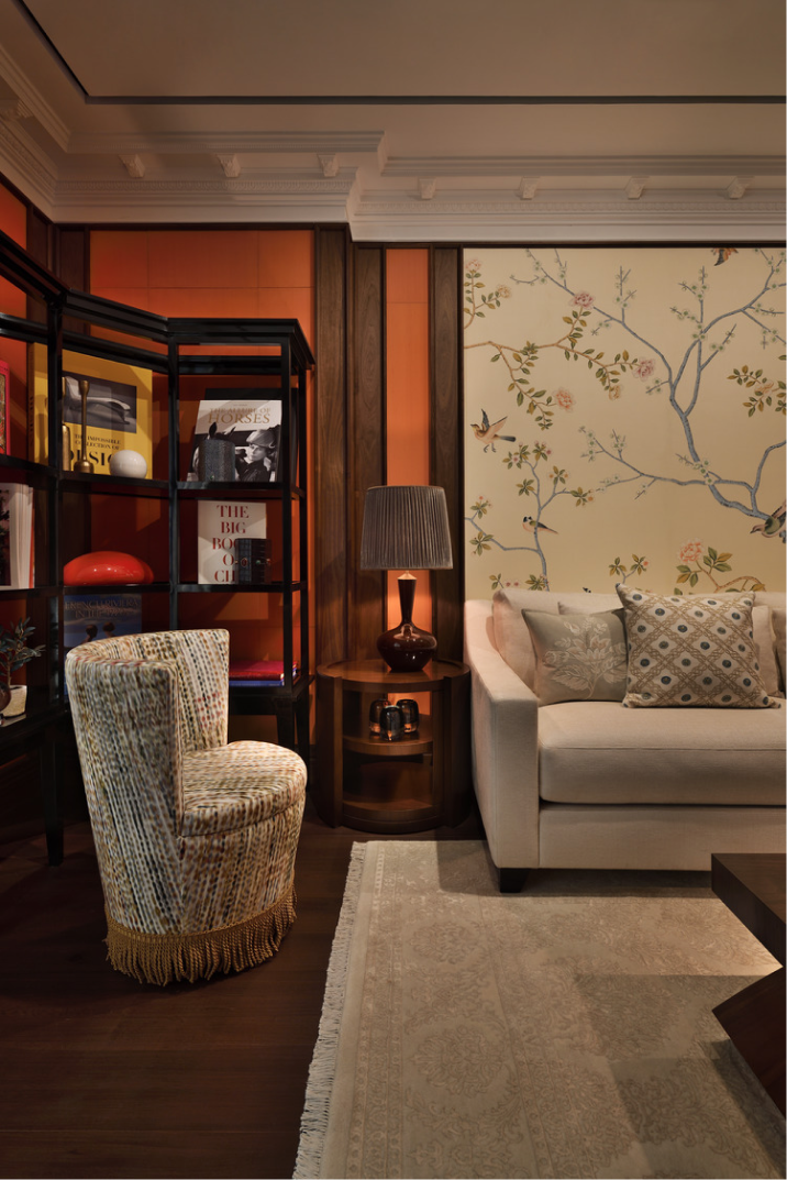 The palette features warm timbers, custom-made furniture upholstered in Pierre Frey fabrics, luxurious orange-coloured Thai silk on the walls, and handcrafted crystal decanters from Venice.